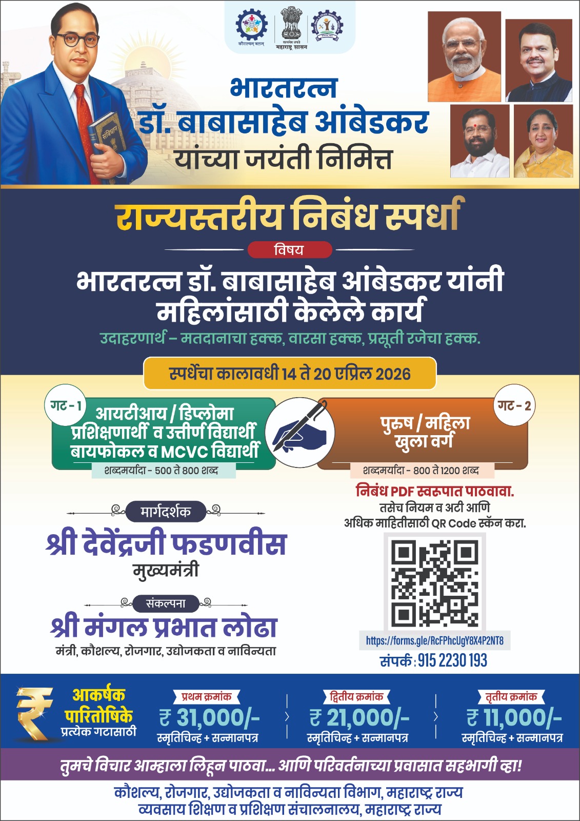 भारतरत्न डॉ.बाबासाहेब आंबेडकर जयंतीनिमित्त कौशल्य विकास विभागाकडून निबंध स्पर्धा