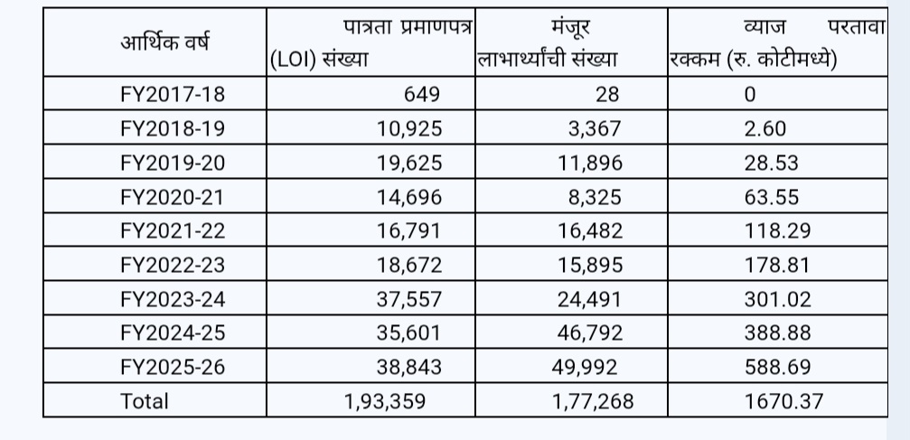 महामंडळामार्फत आजपर्यंत सुमारे ₹1,670 कोटींहून अधिक आर्थिक सहाय्य व्याज परतावा स्वरूपात वितरित करण्यात आले असून, राज्यातील 1 लाख 70 हजारांपेक्षा अधिक लाभार्थ्यांना स्वयंरोजगाराची संधी उपलब्ध करुन देण्यात आली आहे. महामंडळाची योजनांची कार्यवाही सुरु झाल्यापासून वर्षनिहाय फलनिष्पत्ती खालीलप्रमाणे आहे.
