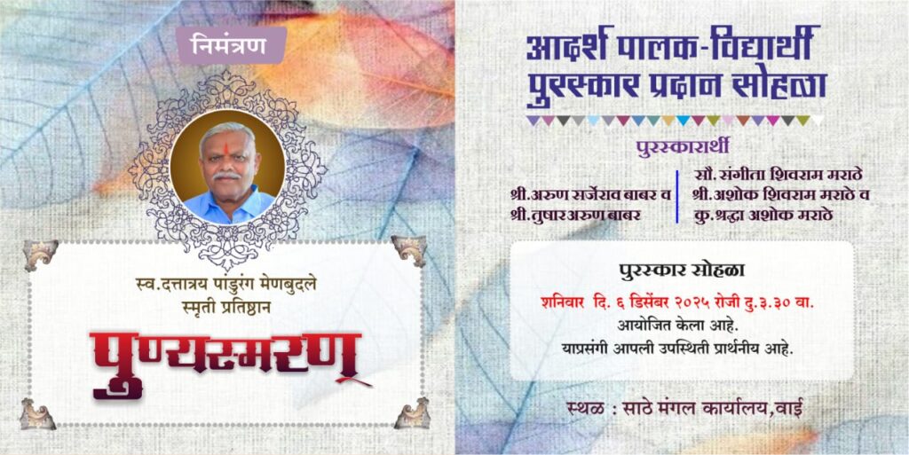 वाई- दक्षिण काशी म्हणून समजले जाणाऱ्या वाई येथे स्वर्गीय दत्तात्रय पांडुरंग मेणबुधले यांच्या पुण्यस्मरणादिनानिमित्त स्वर्गीय दत्तात्रय पांडुरंग मेणबुधले स्मृती प्रतिष्ठान तर्फे दिनांक सहा डिसेंबर रोजी दुपारी साडेतीन वाजता आदर्श पालक विद्यार्थी पुरस्कार प्रदान सोहळा होणार आहे. श्री अरुण सर्जेराव बाबर व तुषार अरुण बाबर.सौ संगीता शिवराम मराठे, अशोक शिवराम मराठे कू.श्रद्धा अशोक मराठे पुरस्कारार्थी असणार आहेत. तर याच वेळी तालुकास्तरीय बाल चित्रकला स्पर्धेचे बक्षीस समारंभ सुद्धा आयोजित केल्याची माहिती संयोजकांनी दिली. तसेच शनिवार दिनांक 6 डिसेंबर 2026 रोजी रक्तदान शिबिर आयोजित करण्यात आले आहे. विजयकुमार परीट गटविकास अधिकारी पंचायत समिती वाई डॉक्टर सचिन पाटील वैद्यकीय अधिकारी वाई यांच्या प्रमुख उपस्थितीत रक्तदान शिबिर होणार आहे. आस्था वृद्धाश्रम वाई येथे दुपारी बारा वाजता अन्नदान होणार आहे.